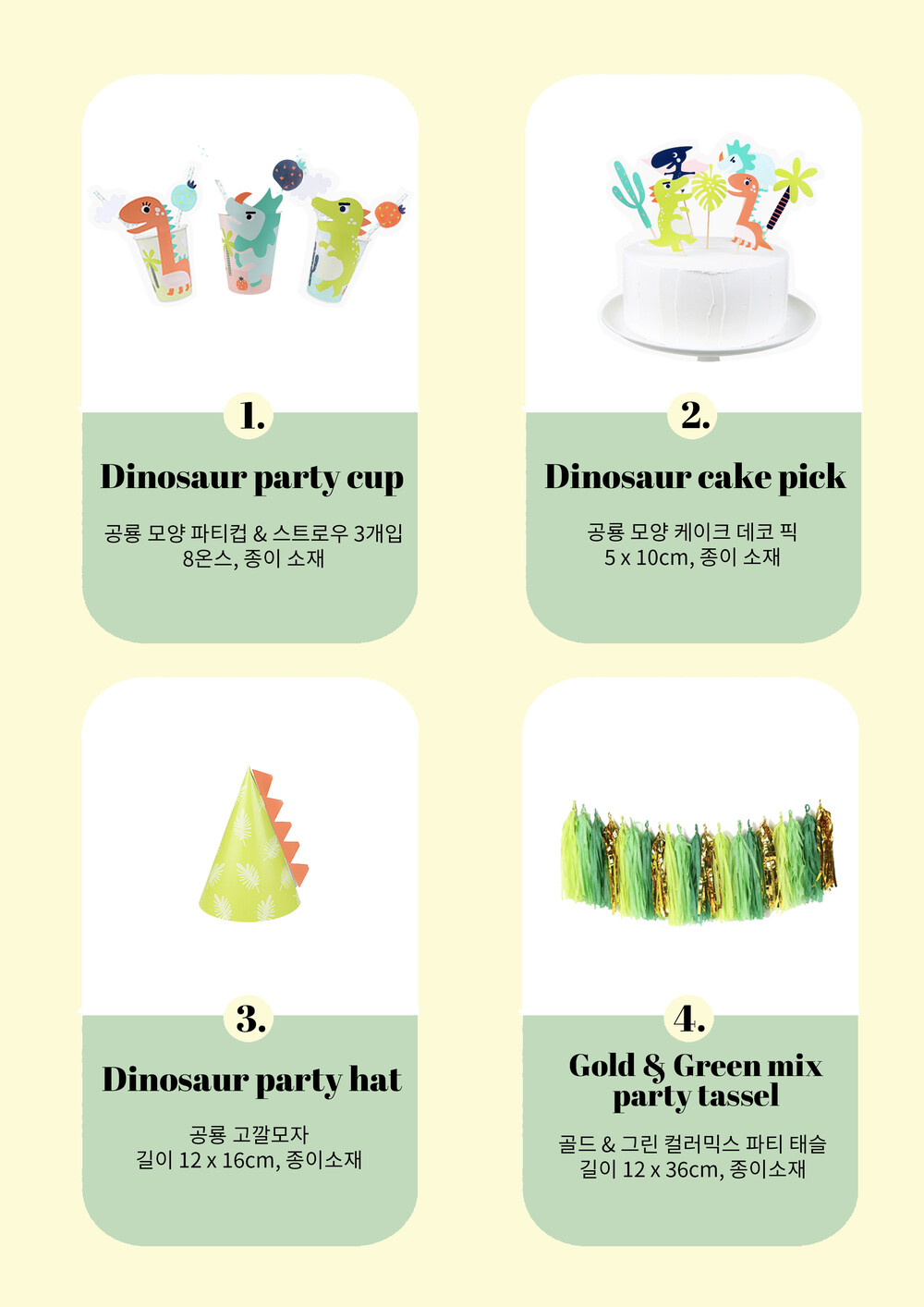 깜찍한 일러스트로 표현된 공룡 제품들이 파티에 멋진 포인트를 주어요!