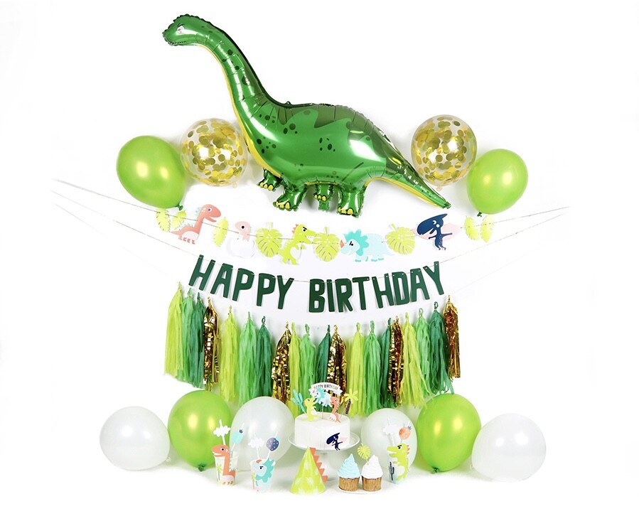 (공룡 호일풍선, 라운드 풍선세트 10EA, 종이 DIY 공룡 가랜드 1EA, 종이 DIY 생일 가랜드, 공룡 고깔모자 1EA, 공룡 파티컵 3EA, 공룡 데코픽 세트, 스티키닷, 행잉 트와인끈)