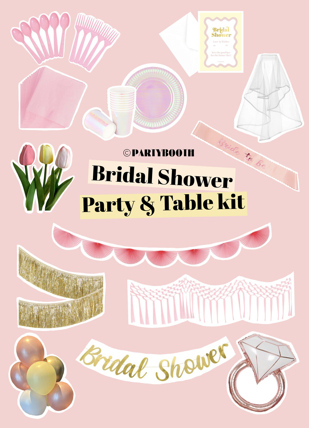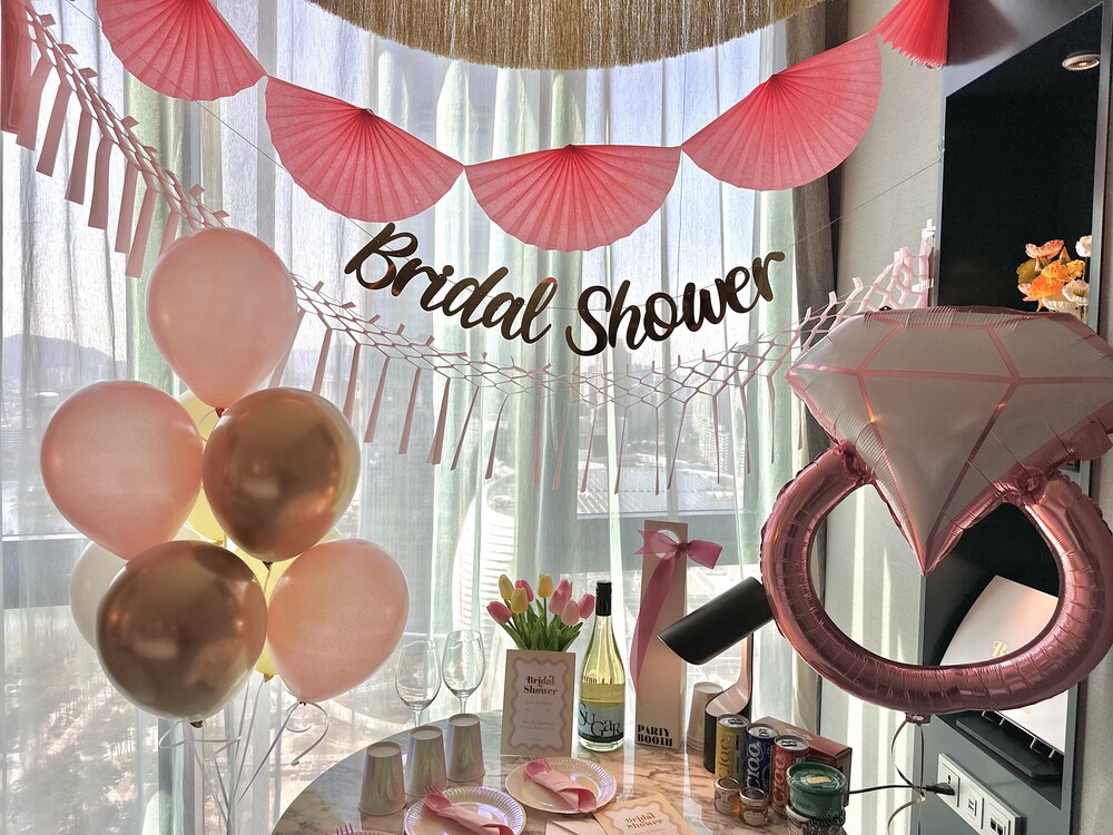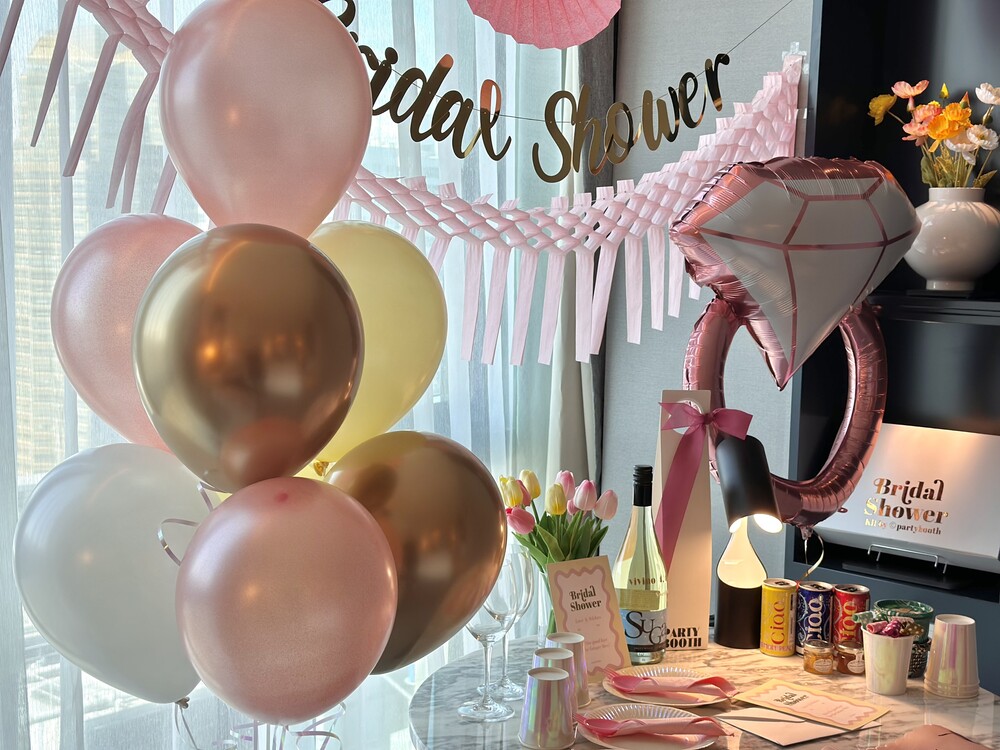 풍선부터 가랜드, 테이블 웨어, 면사포 어깨띠까지! 브라이덜 샤워 파티에 필요한 아이템들로 구성된