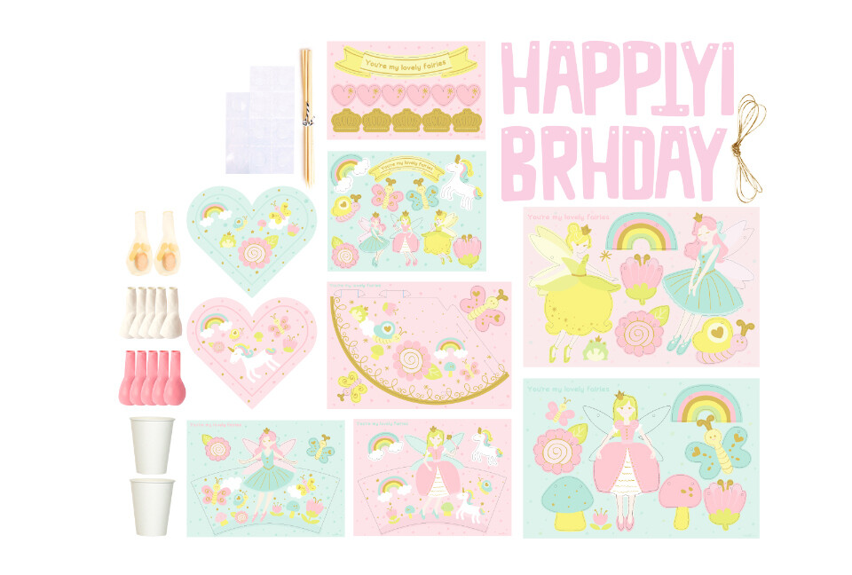 (라운드 풍선세트 12EA, 종이 DIY 요정 가랜드 2EA, 종이 DIY 생일 가랜드, 요정 고깔모자 1EA, 요정 파티컵 2EA, 요정 데코픽 세트, 하트 파티트레이 2EA, 스티키닷, 행잉 트와인끈