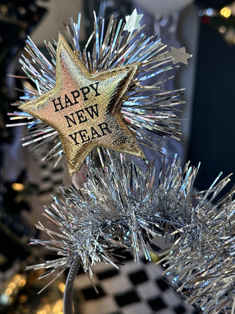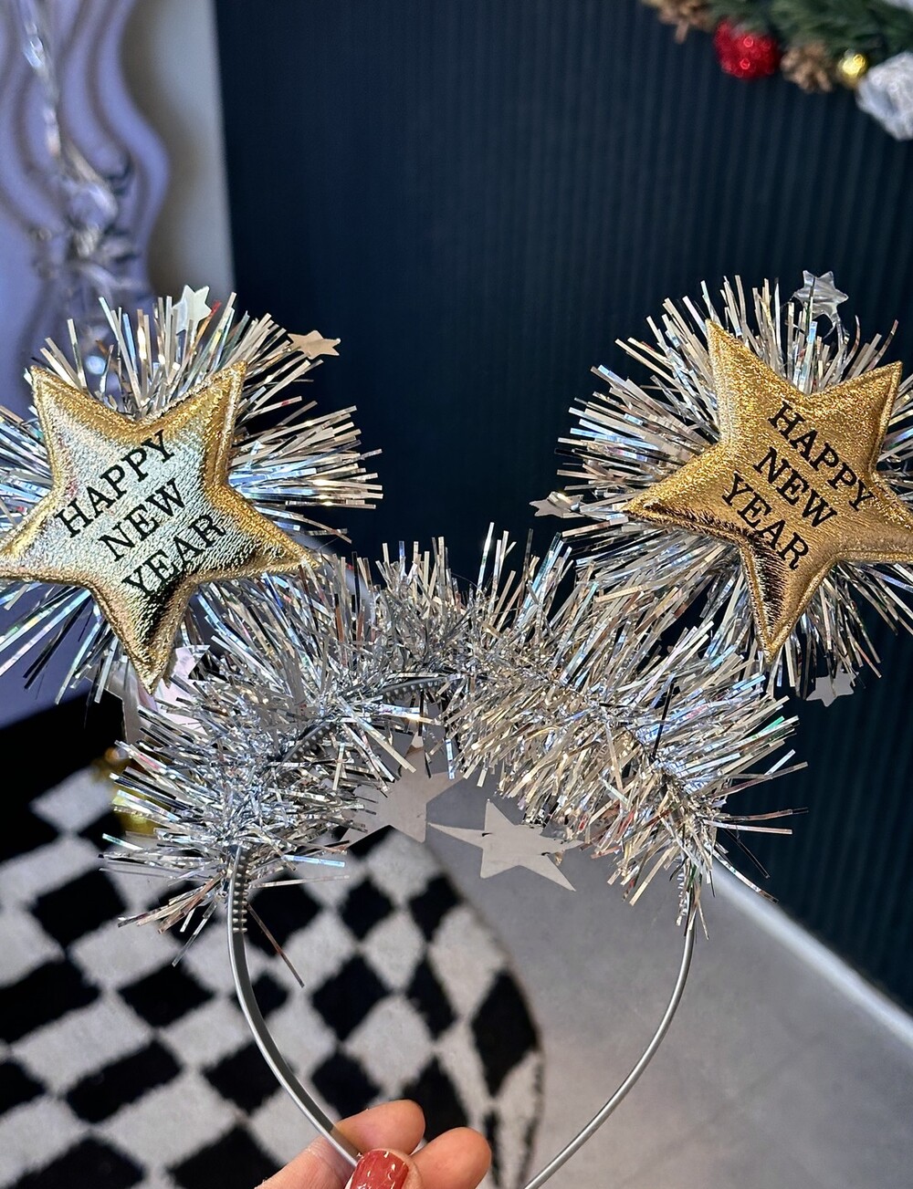 반짝이는 실버 태슬과 별이 달려있는 해피뉴이어 머리띠입니다.