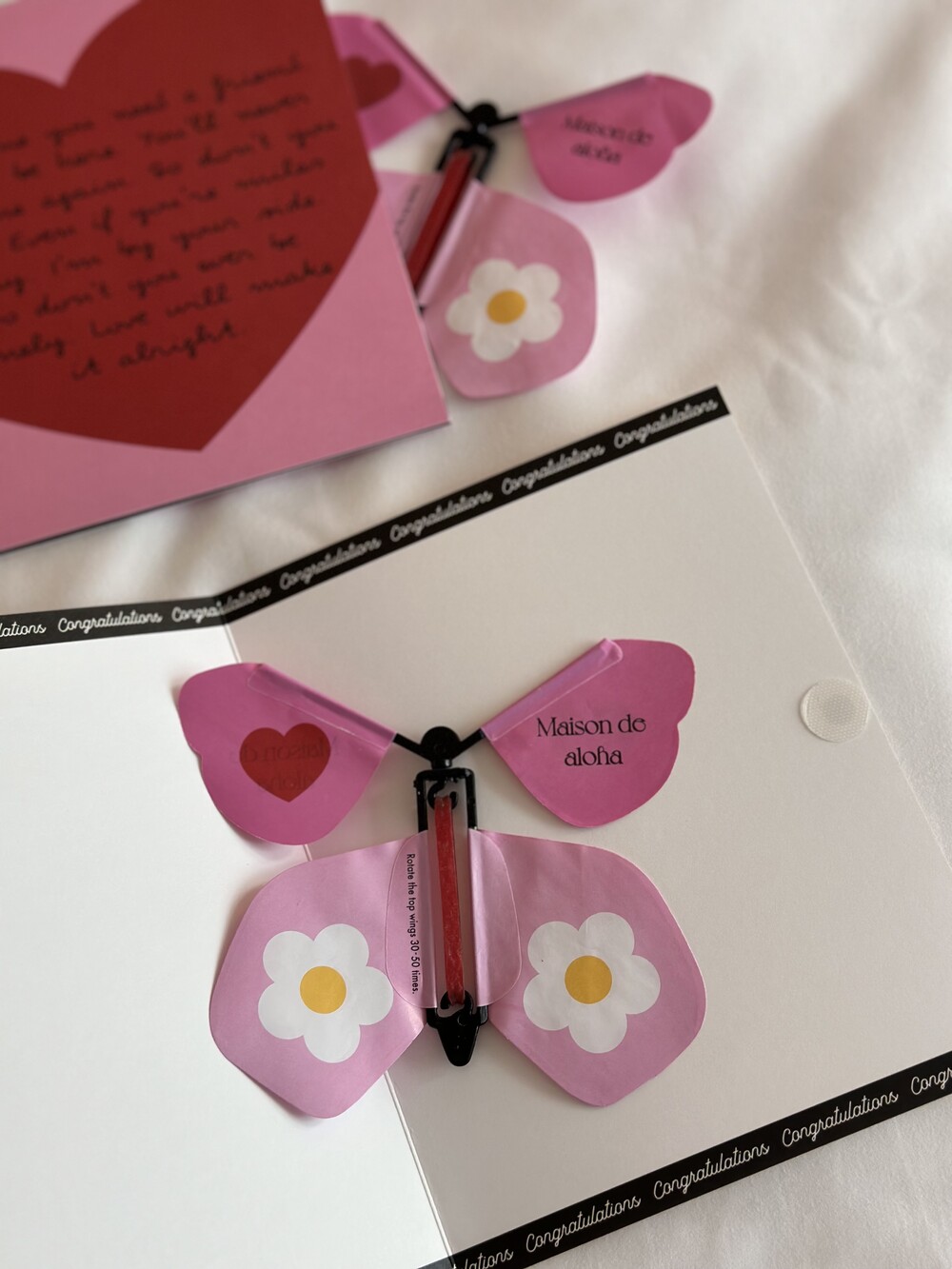 나비의 아랫쪽을 잡고 위쪽 날개를 최소 20번 이상 고무밴드를 감아준 뒤 카드 속에 넣고 닫아주면 서프라이즈 완성!